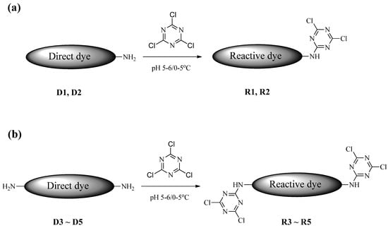 Synthesis of reactive dyes R1~R5 from direct dyes D1~D5. (a) Dyes with a single reactive group. (b) Dyes with multiple reactive groups.