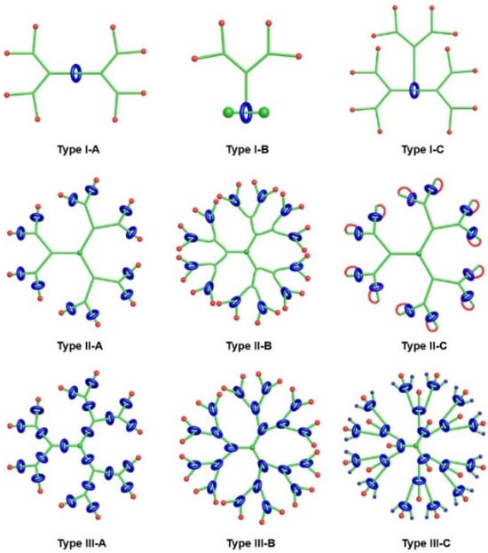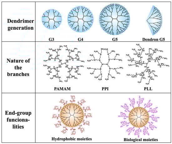 In conclusion, the properties of the dendrimers are mainly determined by (i) the generation (G1, G2, G3, …), (ii) the chemical nature of the branches, e.g., PAMAM, PPI, etc., and (iii) the end-group functionalities (Figure 1).