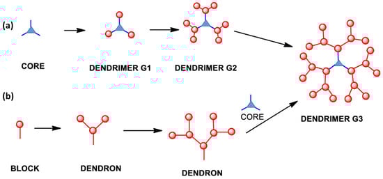 This methodology, initially reported by Hawker and Fréchet in 1990 [], involves the stepwise formation of different branches, known as dendrons, which ultimately culminates in the synthesis of the dendrimer’s final macrostructure via a final bond with the core.