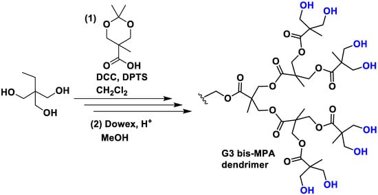 These are a unique class of dendrimers in which the components are linked using ester bonds. While various types of polyester dendrimers have been reported, those based on 2,2-bis(hydroxymethyl)propanoic acid (bis-MPA) are the most prevalent. One of the notable advantages of bis-MPA is its availability at a low cost, making it an economically viable option. Its preparation consists of an esterification in dichloromethane with the DCC coupling agent in the presence of the catalyst DPTS (Figure 3). Subsequently, the protection group was removed easily under mild conditions by stirring the acetonide derivatives in MeOH in the presence of the acidic resin Dowex 50W []. Nowadays, several companies offer dendrons and dendrimers of bis-MPA, providing accessible options for researchers interested in utilizing these structures. Typically, the end-group functionalities of these dendrimers consist of alcohol moieties, which offer the versatility to bind other functionalities, often via the formation of carbamates []. Moreover, the presence of these alcohol moieties not only imparts remarkable water solubility but also offers the advantage of reduced toxicity compared to the previous dendrimers due to their neutral charge. Importantly, MPA dendrimers exhibit superior biodegradability compared to PLL polymers, primarily due to the lower stability of ester bonds in comparison to amide bonds. For this reason, they are extensively applied in biological applications [].