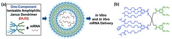 (a) Schematic representation of the dendrimersomes based on ionizable amphiphilic Janus dendrimers (IAJD) developed by Percec’s group for the encapsulation of mRNA. (b) Chemical structure of a typical IAJD. Reprinted with permission from ref. []. Copyright 2021 American Chemical Society.