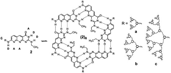 Chemical structure of the monomer and its self-assembly representation to form supra-molecular dendrimers via H-bonding. D, hydrogen bond donor; A, acceptor; R = (a–c). Adapted from ref []. Copyright 2002 American Chemical Society.
