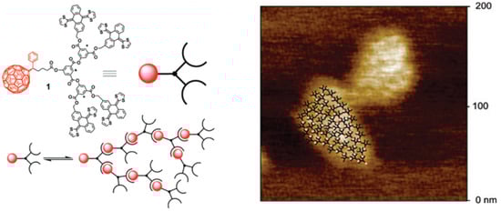 Supramolecular dendrimers self-assembled using π–π and van der Waals interactions are less studied than hydrogen bonding. An example of this new type of non-covalent organization of electroactive materials, bridging the gap between dendrimers and supramolecular polymers, was presented by N. Martín []. The group of Nazario investigated the potential of a receptor for C60 based on the concave–convex complementarity between the curved aromatic surface of the electron donor and the convex exterior of C60. They designed a bifurcated molecule (Figure 6) containing two units of their fullerene receptor covalently linked to a PC61BA derivative. The expectation was that the monomer would self-assemble to form treelike supramolecular dendrimers via weak non-covalent interactions, primarily π–π interactions.