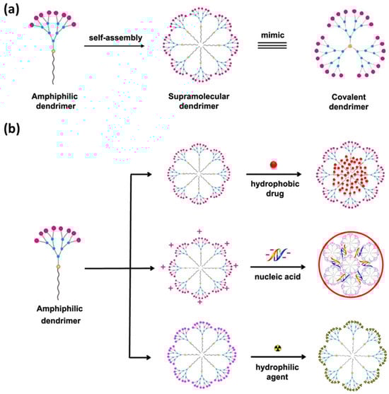 (a) Representation of the amphiphilic dendrimer self-assembly as a supramolecular dendrimer that mimics a covalently linked dendrimer. (b) Scheme of the delivery of hydrophobic bioagents via supramolecular dendrimers. Adapted from ref. []. Copyright 2020 American Chemical Society.