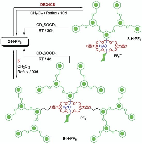- Wang, X.-Q.; Li, W.-J.; Wang, W.; Wen, J.; Zhang, Y.; Tan, H.; Yang, H.-B. Construction of Type III-C Rotaxane-Branched Dendrimers and Their Anion-Induced Dimension Modulation Feature. J. Am. Chem. Soc. 2019, 141, 13923–13930. [Google Scholar] [CrossRef]