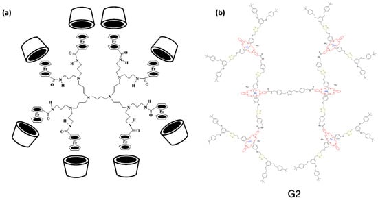 Supramolecular dendrimers are a class of highly branched macromolecules formed via the self-assembly of repeating subunits, known as dendrons []. Unlike traditional dendrimers, which rely on covalent bonds, these are held together and stabilized using reversible non-covalent interactions, such as hydrogen bonding, electrostatic, π−π, or metal–ligand interactions [,]. The dynamic behavior of the physicochemical properties ascribed to non-covalent interactions can be reversible, enabling supramolecular dendrimers to exhibit responsiveness to various external stimuli, such as changes in pH, temperature, and/or the presence of specific molecules []. Some of the key properties and advantages of supramolecular dendrimers, in contrast to covalently bonded dendrimers, are as follows: easy modification due to the accessible functional groups on their periphery, and the reversibility and tunability of their dendrimer structure.