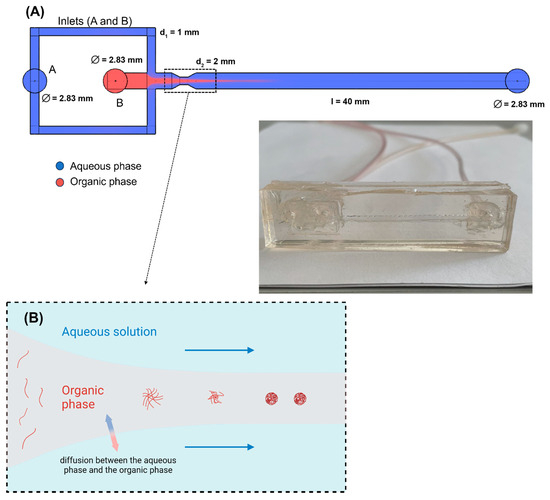 Flow-focusing microfluidic device for NP formulation. (A) Schematic of the microfluidic device. (B) Proposed mechanism of NP formulation. Created with BioRender.com, accessed on 17 October 2023.