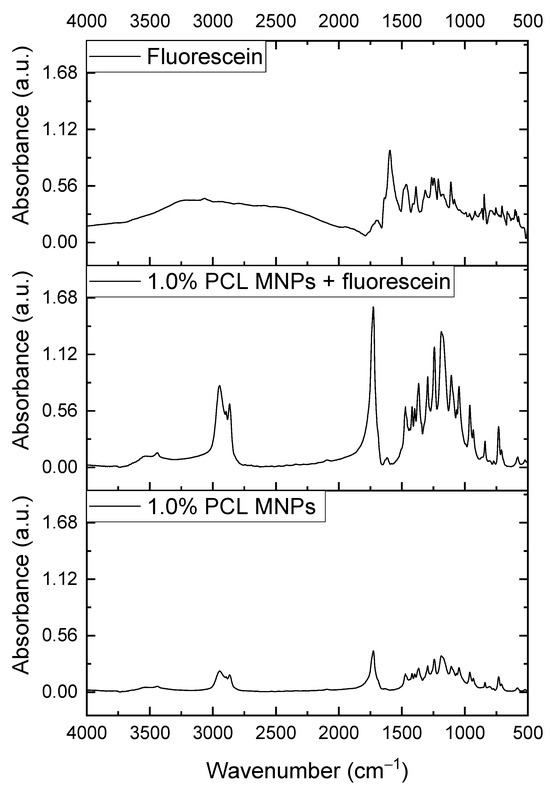 To confirm nanoparticle chemical composition, FTIR analysis was carried out on pure fluorescein, blank MNPs, and MNPs loaded with fluorescein (Figure 4). All compounds presented their characteristic bands. The MNPs showed a band with asymmetric and symmetric stretching of C-H2 at 2940 cm−1 and 2869 cm−1, respectively. Moreover, a peak corresponding to carbonyl stretching at 1722 cm−1 was observed as well. The band at 2867 cm−1 was related to the stretching vibration of the C–H bond from Pluronic®F-127; at 1187 cm−1, a band of the C–O bond stretching appeared [50]. For fluorescein, the C=C stretching was observed within the range of 1643–1465 cm−1 [51]. Increasing PCL concentration in NP formation process does not change the shape of the spectrum; it only decreases the peak intensity (Figure S1, Supporting Information). This report supported the successful encapsulation of fluorescein into the formulated nanoparticles.
