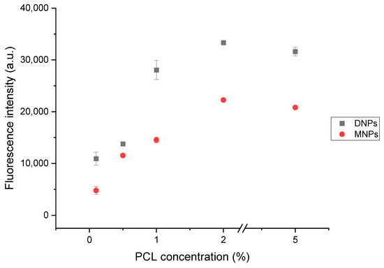The relation between fluorescence intensity and increasing concentration of fluorescein-loaded DNPs and MNPs (1% PCL = 10 mg/mL).
