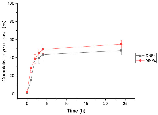 In this study, both groups had relatively small mean diameters—DNPs at 151 nm and MNPs at 127 nm. During the experiment, it was noticed that DNPs exhibited a lower cumulative dye release of 48% compared to MNPs, which showed a relatively higher cumulative release of 55%. This difference could be explained by the fact that smaller nanoparticles possess a larger surface area, which results in a higher concentration of dye molecules at the surface of the NPs, ultimately leading to a faster dye release [53,54,56]. This observation has significant implications in the field of drug delivery as it provides a deeper understanding of the impact of particle size on drug release kinetics.