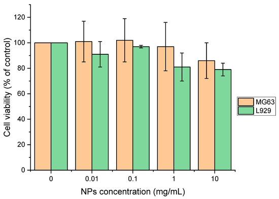 Cytotoxicity assessment of 1.0% PCL MNPs in two different cell lines, osteosarcoma cells MG63, and mouse fibroblast cell line L929. Cell viability (%) was calculated as (B)/A * 100), where A and B are the absorbances of control and treated cells, respectively. Values represent means ± SDs (n = 6).