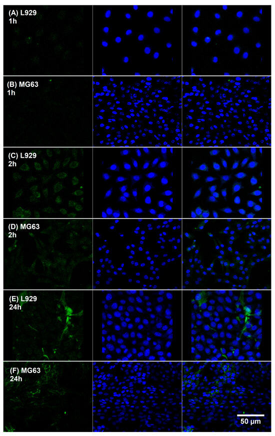 To evaluate the penetration of the NPs into the cells and the targeting effects of the loaded NPs, cellular uptakes of the MNPs were performed using L929 and MG63 cell lines. The lipophilic dye, fluorescein, was chosen in this study because the water solubility of fluorescein is poor and it could be easily encapsulated into the hydrophobic cores of the NPs [57]. The internalization of fluorescein-loaded NPs incubated for 1, 2, and 24 h was visualized using confocal laser scanning microscopy (CLSM). To observe the cellular distributions of NPs, we visualized green fluorescence from fluorescein and blue fluorescence from DAPI nuclei labeling. The fact that nanoparticle uptake by L929 and MG63 cells was significantly higher at 24 h compared to 1 or 2 h of incubation highlights the time-dependent accumulation of these nanoparticles within the cells. It was demonstrated that particle size determines both the mechanism and rate of intracellular uptake as well as the ability of a particle to permeate through tissue [58,59]. Indeed, the size of a particle can affect the efficiency and pathway of its cellular uptake by influencing its adhesion and interaction with cells [60]. A qualitative approach to cellular fluorescence revealed a gradual increase over 24 h, with evidence of a significant increase in payload release over time (Figure 9). Moreover, after 24 h, we could observe that the dye was cumulating in regions around the nucleus (Figure 9E,F). These results indicate that NPs loaded with a high fluorescein concentration release their cargo intracellularly. We suggest that lysosomal acid hydrolases may facilitate release in our experiments after the initial distribution of NPs in early endosomes and lysosomes due to the presence of PCL, a polyester highly sensitive to hydrolases [61]. The hydrolysis of the polyester leads to the destabilization of the vesicle structure, possibly leading to the accelerated release of fluorescein at physiological temperature (~37 °C) compared to the storage temperature (room temperature) of the NP formulation. Further high-resolution imaging studies will allow the better description of this process.