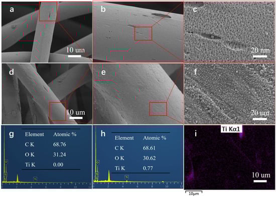 The microscopic surface structures of the PET and NC-TiO2/PET were observed using FE-SEM. From Figure 1a–c, it can be seen that the surface structure of the pretreated polyester fiber was rough and that the fiber’s diameter was about 10–20 μm. Figure 1d–f shows the magnified images of the NC-TiO2/PET. The high-resolution FESEM image in Figure 1f shows that the surface of the NC-TiO2/PET had an even distribution of nanoparticles (NPs) on the individual fibers and that the average diameter of these NPs was 10 nm. Compared to the pure PET fabric, the atomic percentage of Ti on the NC-TiO2/PET surface reported was about 0.77%, according to the EDS results in Figure 1g,h. Furthermore, the EDS mapping in Figure 1i indicates that the TiO2 was densely and homogeneously distributed on the surface of the PET fabric.
