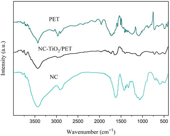 FTIR spectra of PET, NC-TiO2/PET, and NC.