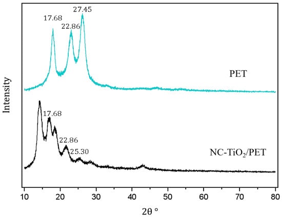 The XRD pattern of the PET showed a characteristic diffraction peak of polyester fiber at 2θ = 17.68° and another peak near 22.86° (Figure 4). The XRD pattern of the NC-TiO2/PET showed a characteristic diffraction peak of TiO2 at 27.45°, in addition to the characteristic diffraction peak of the PET. The characteristic diffraction peak of the (110) and (111) crystal planes of the TiO2 appeared at 27.45° and 42°, respectively, which are consistent with results in the previous literature [24]. This implies that the surface of the polyester fiber was successfully loaded with anatase-phase TiO2 nanoparticles.