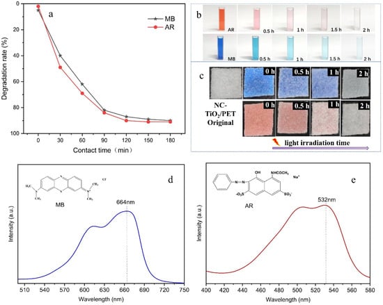 Degradation rate curves of the NC-TiO2/PET for the MB and AR dyes at different times (a); photos of the dye solution and the NC-TiO2/PET materials at different photocatalytic light irradiation times, (b,c); and the UV-vis spectra and chemical formulas of the dyes MB (d) and AR (e).