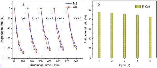 (a) Photocatalytic cyclic degradation of MB and AR using NC-TiO2/PET; (b) circulating antibacterial rate of NC-TiO2/PET against bacteria.