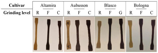Triticum aestivum L.) cultivars (Altamira, Aubusson, Blasco, and Bologna) were milled separately by AMAP (Jesi, Ancona Province) by using a laboratory mill (Labormill, 4.RB, R. Bona SRL, Monza, Italy) with a standard procedure to obtain refined flours (R), and another laboratory mill (Bühler MLI-204, Bühler AG, Uzwil, Switzerland) to obtain wholegrain flours, which was set at two extremely different grinding levels, 0 and 9, corresponding to very fine (F) and very coarse (C) grinding. The four cultivars were selected among the 26 considered by Benincasa et al., taking into consideration the different grain hardness of the cultivars and the different alveographic characteristics (P, L, P/L, W) of the refined flours and tensile properties of the derived thermoplastic films (strength, σ; elongation at break, ε) [