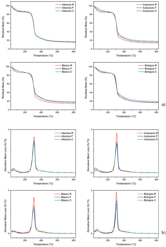 Thermogravimetry: The thermal degradation of the twelve wheat flours, obtained from four bread wheat varieties subjected to three different milling procedures (R, F, C), was evaluated performing a dynamic thermal test, from 30 °C to 900 °C by thermogravimetric analyzer (TGA, Seiko Exstar 6300, Tokyo, Japan). About 10 mg of each sample was used, and dynamic tests were performed under nitrogen flow (200 mL·min−1). At the constant heating rate of 10 °C min−1, the mass loss (TG) and mass loss rate (DTG) curves of each flour were evaluated.