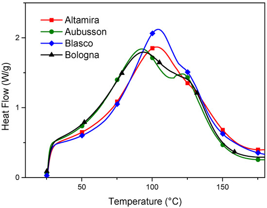 28]. As the temperature increases, plasticization with glycerol is also activated, producing the superposition of the transformation peaks of the two-plasticizer system and adding their enthalpies. Depending on the composition of the starch, and in particular the characteristics of the amylose, different peak shapes are noted for the different flours. In particular, for Aubusson, the two peaks are distinguishable at 91.8 °C and 121.2 °C; for the other flours, the second peak overlaps the first (93–103 °C), forming a shoulder at a higher temperature (122–134 °C) compared to the main peak [