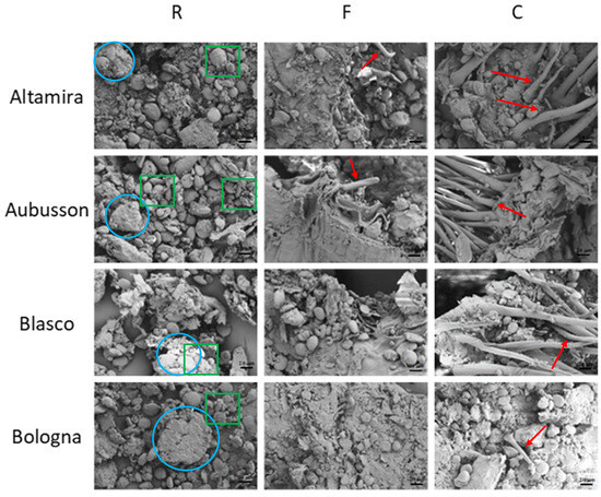 33]. It is noted that, in R flours, the bran content is very low and has smaller dimensions compared to wholegrain F flours. The difference appears even more evident when comparing R flour to wholegrain C flours, which show fragments of bran and brush hairs of the wheat grain measuring tens of micrometers (red arrows). The SEM images point out the morphological differences between the different milling levels and, in some aspects, between the flours obtained from different wheat varieties.