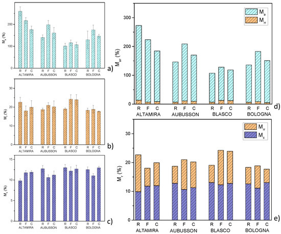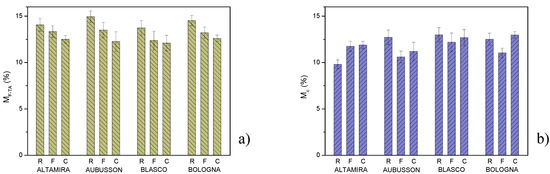 Figure 6b, the mass loss is between 17.6% wt. of Bologna C and 24.2% wt. of Blasco F. For the measurement method used, part of this mass loss consisted of the previously measured moisture content M