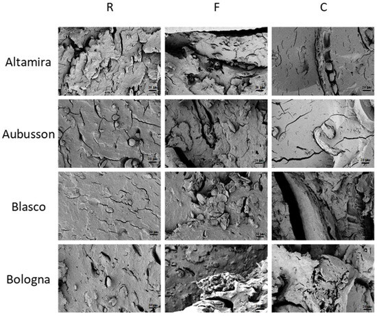 Figure 7, column left) appeared well plasticized with a uniform surface and no evident bran particles can be noted. In detail, Altamira R shows a plasticized surface that is not very compact, with some cracks and no visible starch granules; the Aubusson R fracture surface showed well-plasticized results, with few cracks but with some separate starch granules. The Blasco R micrograph shows a compact surface, with some grooves and steps and only a few small cracks but no separated starch granules. The morphological aspect of the Bologna R fracture indicates a compact and well plasticized material, free of cracks and with some starch granules well interfaced with the matrix which, on a microscopic scale, resemble gravel aggregates.
