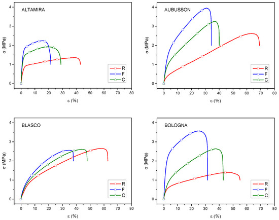 Figure 8. In general, all thermoplastics bulk samples from refined flours were less resistant and more deformable than the corresponding samples from wholegrain flours. Furthermore, in samples from wholegrain flours of all varieties, the coarse bran particles increased the strength and decreased the deformability as compared to the fine bran. This result, if correlated to the morphological analysis carried out on the samples of wholegrain flour C, suggests that coarse bran particles cause, together with an effective fibrous reinforcement effect, also defects which constitute points of poor transmission of the matrix/reinforcement forces, delamination and therefore triggering of fractures, which compromise their real effectiveness. In general, the negative effect of defects due to the presence of bran fiber is much less evident for composites based on wholegrain F flours; this may be motivated by the smaller size of the bran particles, which are better dispersed and connected to the biopolymer matrix which covers them uniformly [