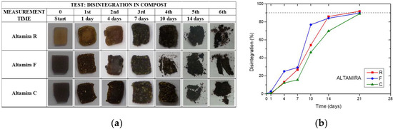 Figure 9b shows the trend of the mass disintegration rate in compost. All materials reached 90% disintegration after 21 days under composting conditions. Altamira C sample showed different disintegration kinetics, presenting lower disintegration values, in comparison with Altamira R and Altamira F. This behavior can be justified considering that greater bran particles slowed down the overall decomposition process of the plasticized fraction, due to the increased lignocellulosic content of such materials, that confers additional stability to the material [