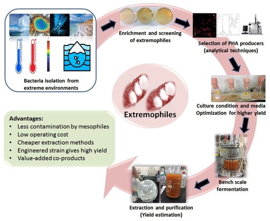 Moreover, the development of technologies to produce PHAs from renewable resources by extremophiles can be more demanding than the production of their counterparts. Waste management and the accessibility of feedstocks used as carbon sources should be taken into consideration as the crucial factors in this bioprocess. Extremophiles might have specific substrate preferences, and the waste feedstocks may contain impurities or inhibitory compounds that affect microbial growth and PHA accumulation. Furthermore, many agricultural wastes and bio-wastes need to be pre-treated in a manner suitable for selected bacteria.