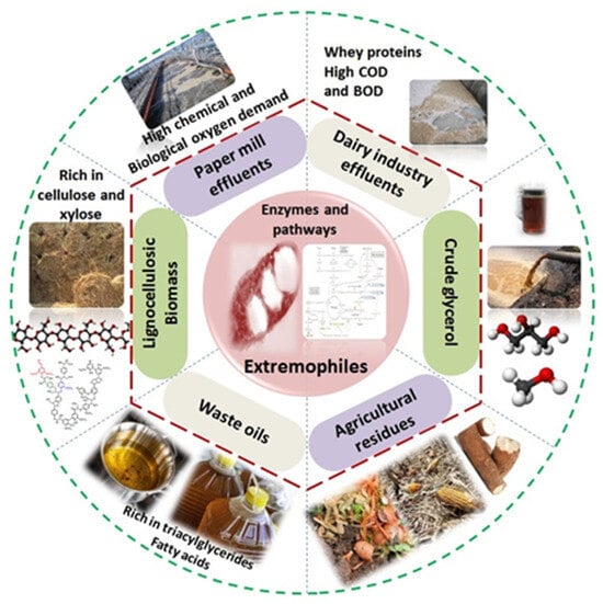 - Zhu, D.; Adebisi, W.A.; Ahmad, F.; Sethupathy, S.; Danso, B.; Sun, J. Recent Development of Extremophilic Bacteria and Their Application in Biorefinery. Front. Bioeng. Biotechnol. 2020, 8, 483. [Google Scholar] [CrossRef]