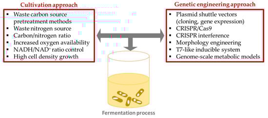 Zhao et al. [66] proposed novel phage-derived expression systems for transcriptional control in Halomonas spp. TD01. The authors proved that the expression of the phaCAB gene, after IPTG induction, involved in P(3HB) synthesis and accumulation enhances this homopolymer content up to 92% of CDM. Moreover, the data from the literature show that redox cofactors are crucial for PHAs production [70]. It was found that H. bluephagenesis utilizes NADH instead of NADPH as a cofactor for P(3HB) production; thus the NADH/NAD+ ratio was engineered to enhance the biopolymer synthesis. Ling et al. [69] blocked an electron transfer flavoprotein pathway to increase the NADH supply, reaching up to 90% P(3HB) in comparison to 84% in cultivation of the wild type. Also, bacterial cell size and shape were changed, allowing better PHA productivity [71,72]. The overexpression of minCD genes, involved in cell division, resulted in the elongation of Halomonas sp. TD08 shape at least 1.4-fold compared with its original size, enhancing P(3HB) content from 69 to 82% of CDM in the elongated cells [2].