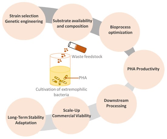 PHA production by extremophilic bacteria from renewable resources poses several challenges that still hamper the commercial success of these bioproducts (Figure 4).