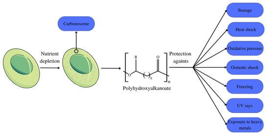 PHAs are recurrently associated with their primary storage function. Nonetheless, a number of studies indicate that the functions of these polymers within the cell are more complex, including protection against stress factors such as thermal shock, oxidative pressure, osmotic shock, low temperatures, and freezing, as well as protection against the effects of UV rays and exposure to heavy metals []. During the growth phase of extremophile microorganisms, PHA accumulates to shield organelles from environmental stress and to support cellular functions [].