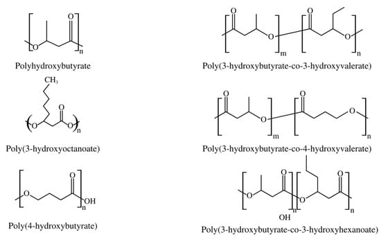 Short-chain PHAs (SCL-PHAs) exhibit high crystallinity, hardness, and fragility, but with slow crystallization rates and low impact resistance, along with rapid aging, making their use difficult. Poly-(3-hydroxybutyrate) (PHB), a homopolymer with four carbon subunits of 3-hydroxybutyrate (3HB), is the most frequent SCL-PHA, but other representatives of this group are poly(3-hydroxyoctanoate) (PHO), poly(4-hydroxybutyrate) (P4HB), poly(3-hydroxybutyrate-co-3-hydroxyvalerate) (PHBV), poly(3-hydroxybutyrate-co-4-hydroxybutyrate) (PHB-4HB), and poly(3-hydroxybutyrate-co-3-hydroxyhexanoate) copolymers (PHBHHx), as shown in Figure 2 [].