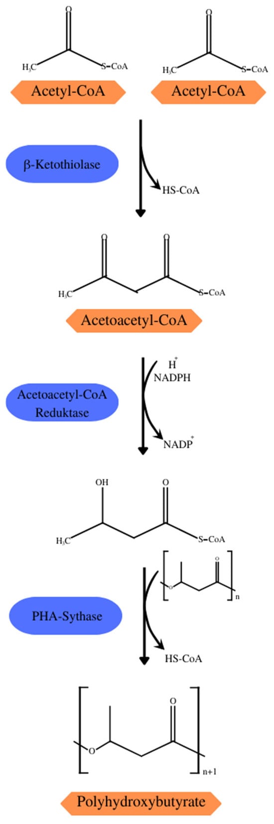 Synthesis of PHB with acetyl-CoA from the Krebs cycle as the precursor.