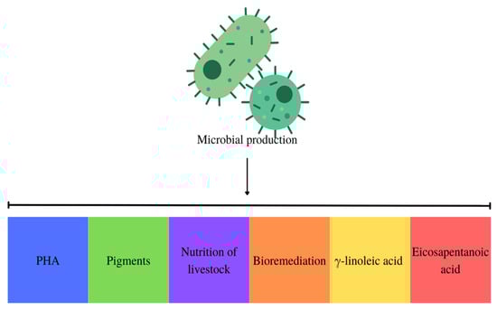 Implementing a circular economy throughout the microbial PHA manufacturing process represents a viable approach to mitigating expenses associated with bioplastic production. By integrating production with wastewater bioremediation, heavy metal and other waste removal, and environmental problem resolution, this approach enables the optimization of output while simultaneously achieving the desired product. An additional element in this approach that aids in the generation of PHA is the incorporation of this substance with other desirable products, such as pigments. Furthermore, residual biomass from cyanobacteria and microalgae used in animal feed production is utilized, and new microbial cultures are established, as illustrated in Figure 5 [].