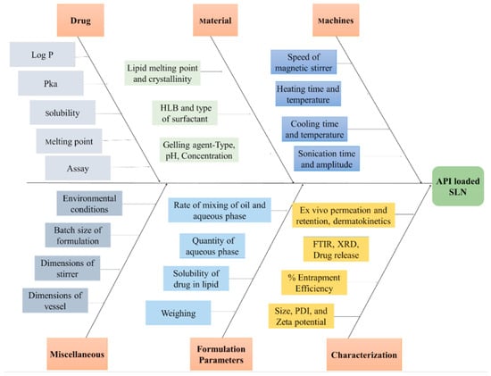 In a fishbone diagram, the desired quality product is usually considered the fish head. Among the effective factors (CPP/CMA), the more general items are considered large fishbones, and the subsets are considered smaller fishbones. For example, in Figure 2, which is related to the study of Rapalli et al., conducted to investigate the behavior of solid lipid nanocarriers embedded in hydrogel for topical delivery of apremilast, it can be seen that the effect of the material, which is a CMA itself, is written on one of the large bones of the fish, and subsets like gelling agent, HLB, and type of surfactant play the role of smaller fish bones. The effect of these factors on characteristics (CQA) such as entrapment efficiency, PDI, or zeta potential is investigated [22]. After that, it is necessary to select the most effective parameters by applying a method. This is because, firstly, by reducing the number of effective parameters, it will be easier to interpret the results in the continuation of this work, and the number of experiments can increase exponentially with the addition of each variable. The risk assessment matrix (RAM) method [59] or the risk estimation matrix (REM) [18] are usually used in the studies.