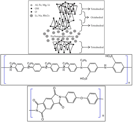 Structure of clay (top), substituted polyaniline copolymer (middle) and polyimide (bottom).