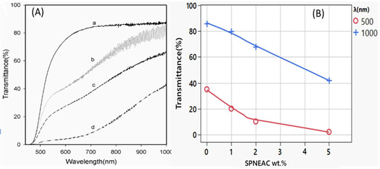 (A) Solid state UV-Vis spectra of (a) neat PI and PI containing (b) 1, (c) 2 and (d) 5 wt.% copolymer/clay [SPNEAC]; (B) dependence of transmittance on the nanocomposite loading at 500 and 1000 nm wavelength, respectively. Transmittance decreases from 85 for the neat PI to 42% for the nanocomposite containing 5 wt.% SPNEAC in the visible and near-infrared region.