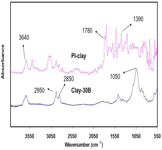 Figure 4 shows the ATR spectra of the 30B clay and PI-30B clay nanocomposites. Typical clay peaks are observed at 2850 and 2950 cm−1 due to methylene and methyl groups present in organoclay, and the absorption band at 1360 cm−1 is due to C-N stretching of the tertiary amine. The 1470 cm−1 absorption band due to the stretching of the phenyl ring is also observed. Figure 3 and Figure 4 confirm the presence of clay in the SPNEAC and PI-clay nanocomposites.