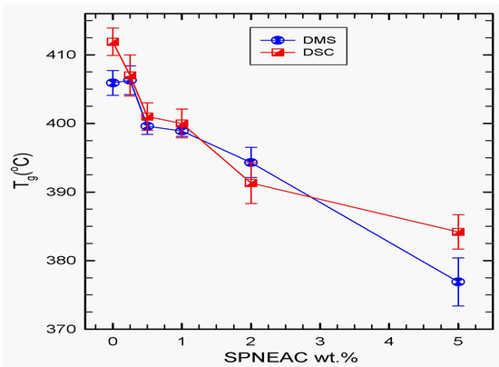Glass transition often occurs as a step in the DSC thermogram, but, in this case, it is not so distinct. We therefore obtained the Tg from the change in slope of the heat capacity and plotted it as a function of composition in Figure 7. The Tg obtained using DSC is also compared to that obtained from the dynamic mechanic spectroscopy, DMS, as shown in Figure 7. There is a good agreement in the results obtained from both techniques at low filler loadings of 0.25–1.0 wt.% SPNEAC.