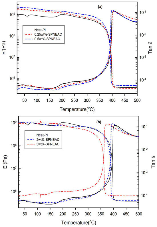 Plot of storage modulus and tan δ against temperature for (a) neat PI, and SPNEAC-PI containing 0.25, 0.5 wt.% SPNEAC, (b) neat PI and SPNEAC-PI containing 2 and 5 wt.% SPNEAC.