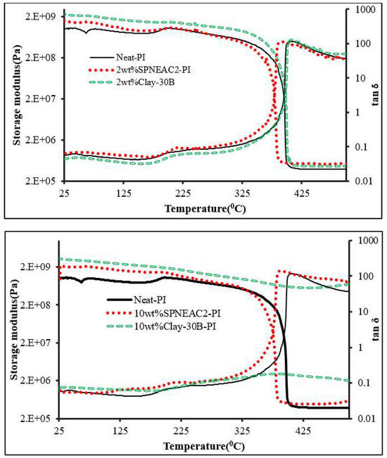 3.4.2. Comparison of the Dynamic Mechanical Properties of Clay 30B-PI and SPNEAC2-PI Nanocomposites