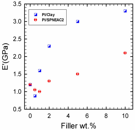The temperature corresponding to the α-transition peak (Figure 9 and Figure 11) is the glass transition temperature. The glass transition temperature (Figure 9 and Figure 11) generally decreased with increasing SPNEAC weight fraction. The decrease in Tg at higher SPNEAC loading could point to increased free-volume and chain flexibility. However, at lower SPNEAC and SPNEAC2 concentrations of 0.25 and 0.5 wt.%, a slight increase in the Tg of the nanocomposite over that for the neat PI was observed. It is also noteworthy that the damping ability of the nanocomposite containing 0.25 and 0.5 wt.% SPNEAC and SPNEAC2 is slightly higher than that for the neat PI. Figure 12 shows the variation of the storage modulus for the clay 30B-PI and SPNEAC2-PI nanocomposites with composition. It is shown that increasing wt.% of the nanofillers resulted in an increased storage modulus. Both nanocomposites show a slight decrease in the storage modulus, E’, for nanofiller wt.% below 2 wt.% nanofillers. However, beyond 1 wt.% 30B clay and 2 wt.% SPNEAC2, a remarkable trend of increasing storage modulus with increasing wt.% nanofillers is clearly demonstrated.