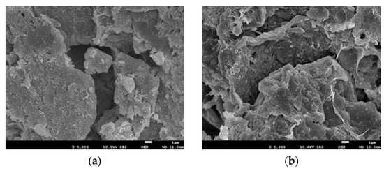 The water retention properties of soils modified by biopolymers have been improved, and the mechanism of the improved water retention properties can be described from the microscopic perspective. Therefore, many researchers have begun to study the changes in soil pores from the microscopic perspective. The commonly used methods in geotechnical engineering include mercury injection [32], scanning electron microscopy [33], nuclear magnetic resonance [34], and so on. As shown in Figure 3 and Figure 4, the scanning electron microscope results of the above microscopic tests are more intuitive, and the mercury injection test results can quantify the pore changes in biopolymer-treated soil. According to the arrangement and distribution of polymers and soil particles in the soil, the polymer block adhesion within and between aggregates is defined as the cementation phenomenon formed due to bond cooperation [35]. The filling effect of the biopolymer on the pores between soil particles and the bonding of the biopolymer ions with charged soil particles can slow down the evaporation of water in the soil mass, thus improving the water-holding characteristics of the improved soil mass. In addition, under the action of multiple dry–wet cycles, changes in the microscopic pore structure of soil samples modified by biopolymers will become obvious [33]. Research on the micro scale is conducive to more convenient and intuitive characterization and interpretation of soil’s pore structure distribution and, furthermore, provides a more accurate and intuitive research method and means for the analysis of soil’s microstructure.