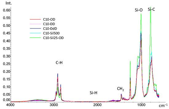 Survey IR spectra (Figure 2) obtained for cross-linked C10 samples confirm the occurrence of the hydrosilylation reaction: the bands at 2168 cm−1, corresponding to the Si-H bond, are completely absent in all spectra. The absence of the characteristic spectral features of double bonds from olefins (bands above 3000 cm−1 from =CH2, 1640–60 cm−1 from C=C and 910 cm−1 from bending vibrations at the CH=CH2 node) indicates the addition of introduced cross-linking agents to both double bonds.