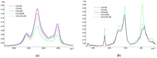 Detailed IR spectra of cross-linked samples C10: (a)—2800–3000 cm−1; (b)—750–1450 cm−1.