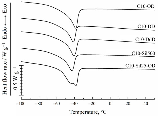 In Figure 4 and Table 2, it is clear that the temperature at the maximum high-temperature peak in the thermogram of the C10-Sil25-OD sample practically coincides with the temperature of the peak maximum in the thermogram of the C10-OD sample. Considering that only 10% of the total number of cross-links in the C10-Sil25-OD sample have a structure different to the structure of the cross-links in the C10-OD sample, it can be assumed that it is the high-temperature part of the bimodal peak that reflects the thermal effect of melting crystallites formed by side C10 substituents (shown in yellow in Figure 1), and low temperature is the thermal effect of melting PDMS crystallites. This assumption agrees well with data regarding the melting temperature of the PDMS homopolymer [36].