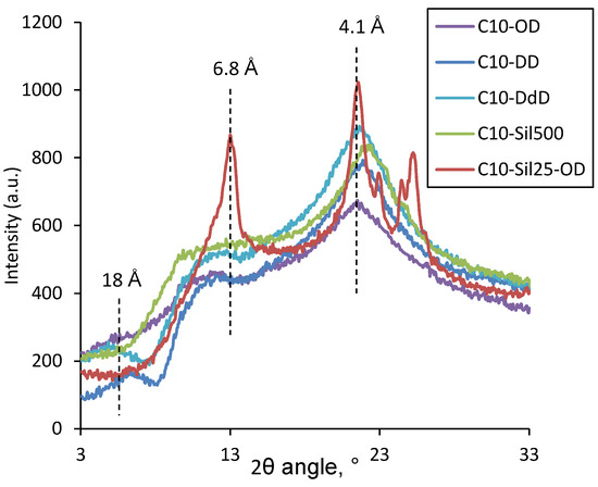 Figure 5 shows that for all the resulting cross-linked C10 samples, a peak is observed in the 2θ region at around 20°. This peak corresponds to an interplanar distance of ~4.1 Å, which, taking into account the data of the classical work of Plate and Shibaev [37], confirms the above conclusion regarding the presence in the samples of crystallites formed by the ordering of side-chain substituents. The C10-Sil25-OD sample exhibits a diffraction pattern characteristic of the crystallites of similar PDMS [27]. The reflection peaks near 2θ > 20° correspond to PDMS backbone crystallization (3.5, 3.6, and 3.9 Å) [38]. Nevertheless, for C10-Sil25-OD, due to combined cross-linking, the following signs of polydecylmethylsiloxane cross-linked with 1,7-octadiene appear: a peak characteristic of the interplanar distance in the crystallites of side-chain substituents; a 10–15° plateau, related to the interplanar distance of bridges of cross-links (9–11 Å); and polymer chains, separated by side chains (8–18 Å). Such a plateau is observed for all cross-linked C10 considered in this work and can be decomposed into a series of Gaussian peaks. The above is fully consistent with the assumption made above regarding the reasons for the appearance of the bimodality of the peak in the DSC thermogram of the C10-Sil25-OD sample. The values of interplanar distances obtained via calculation are presented in Table 3.